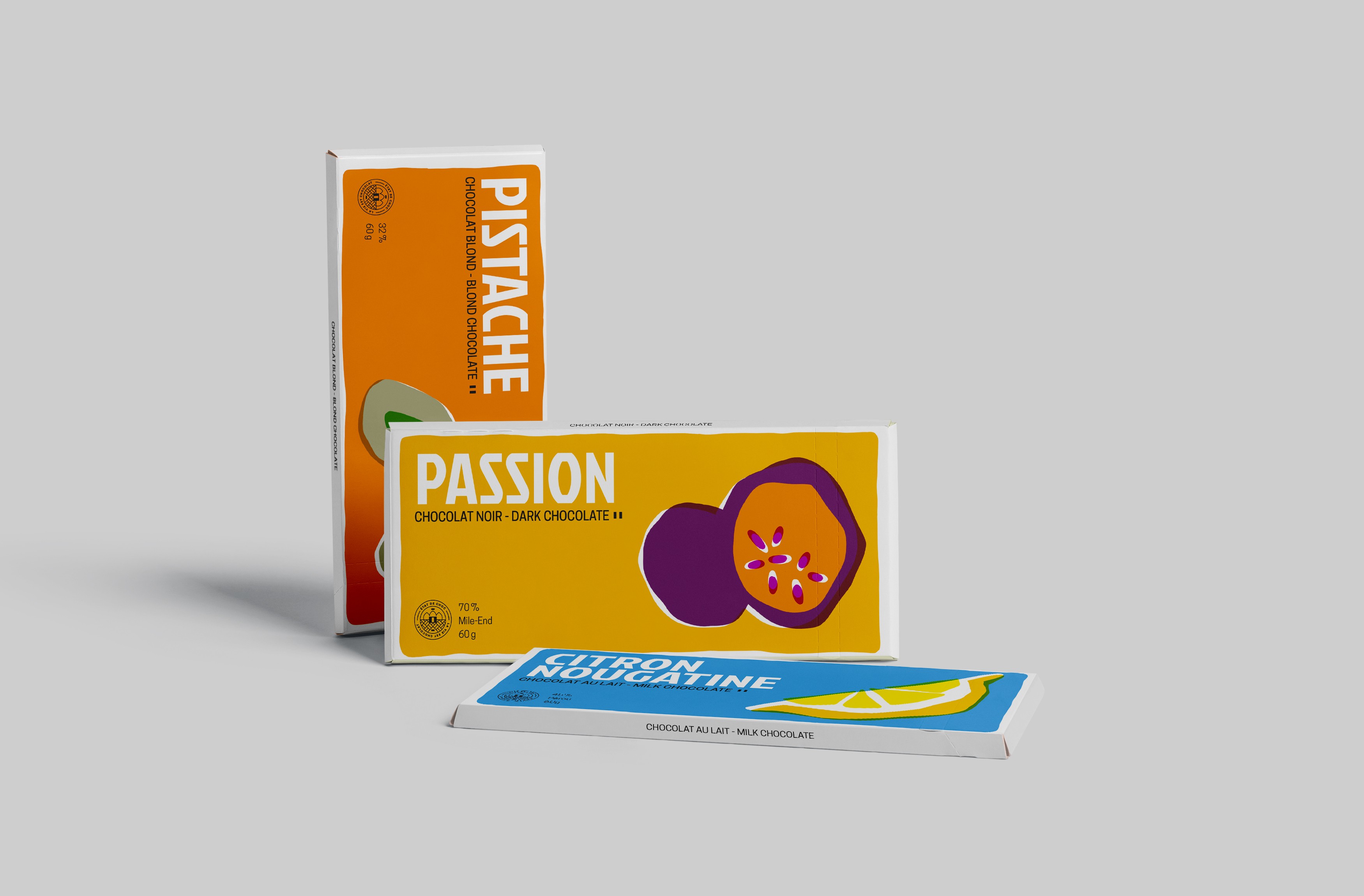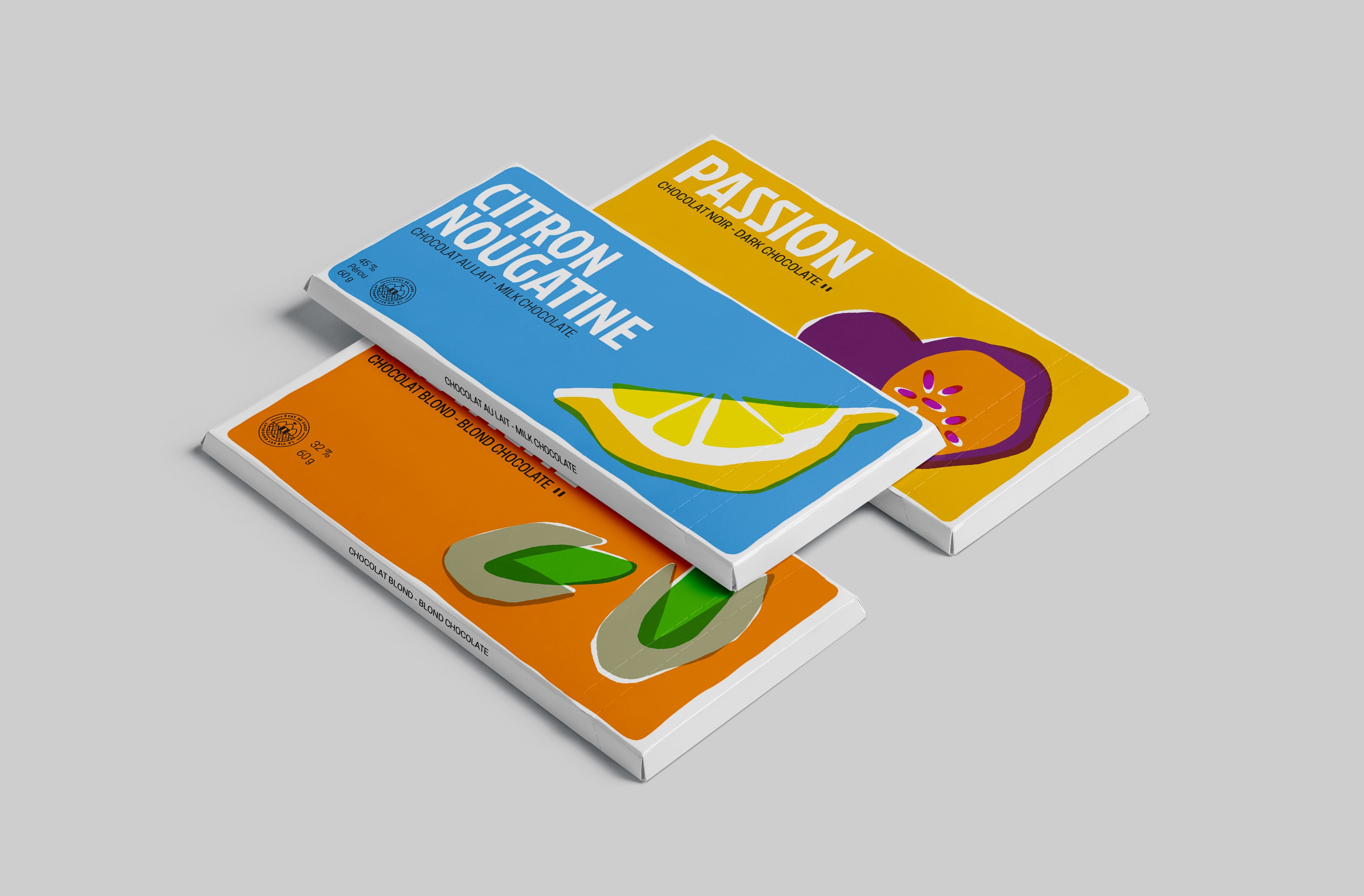 Refonte d’un emballage de palettes de chocolat à saveur de fruits. Conception d’un gabarit personnalisé et montage de la maquett e finale. Contrairement à l’emballage initial, la nouvelle version communique l’aspect ludique du produit et met de l’avant ce qui le démarque : les fruits. Le style illustratif innocent a pour but de repositionner le produit et d’att eindre une nouvelle clientèle cible qui est plus jeune.