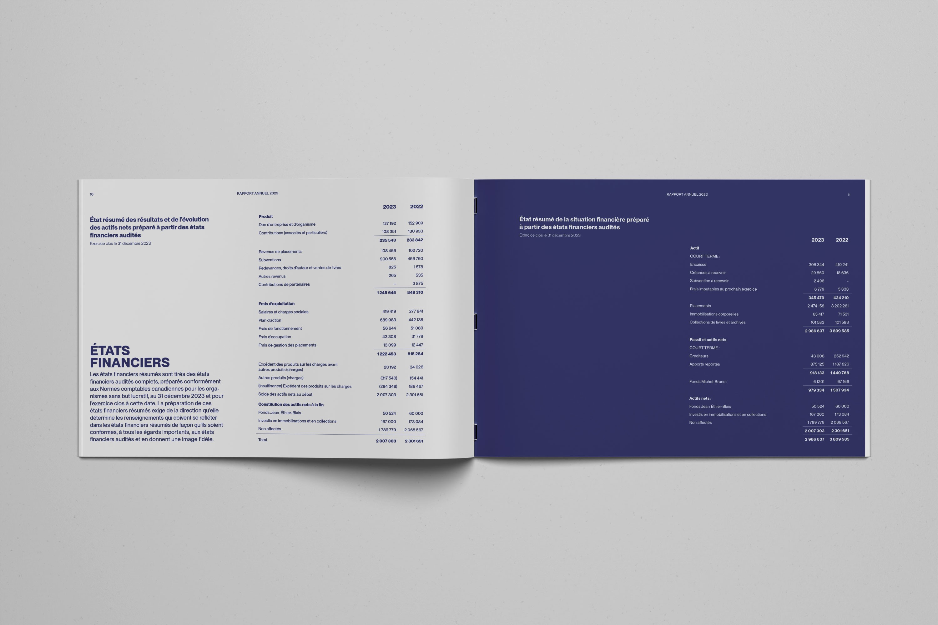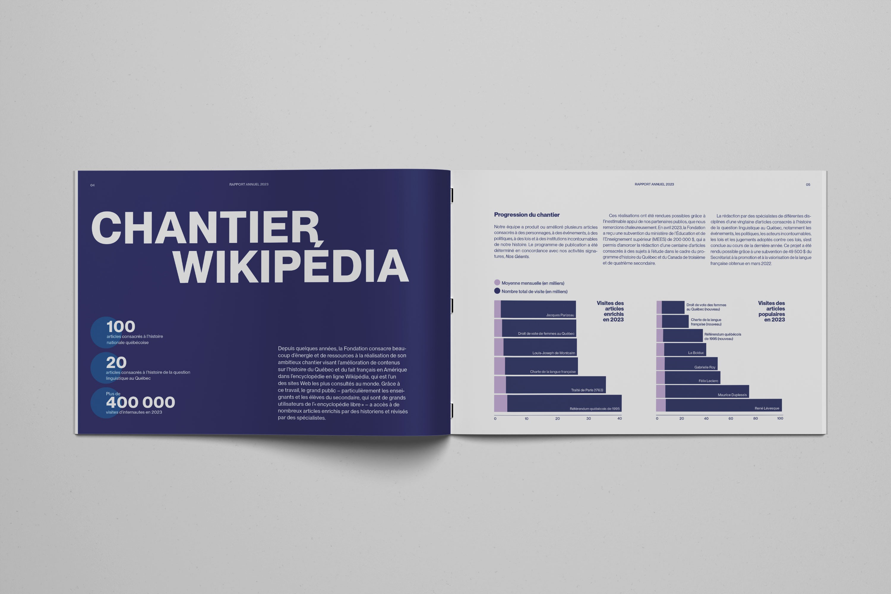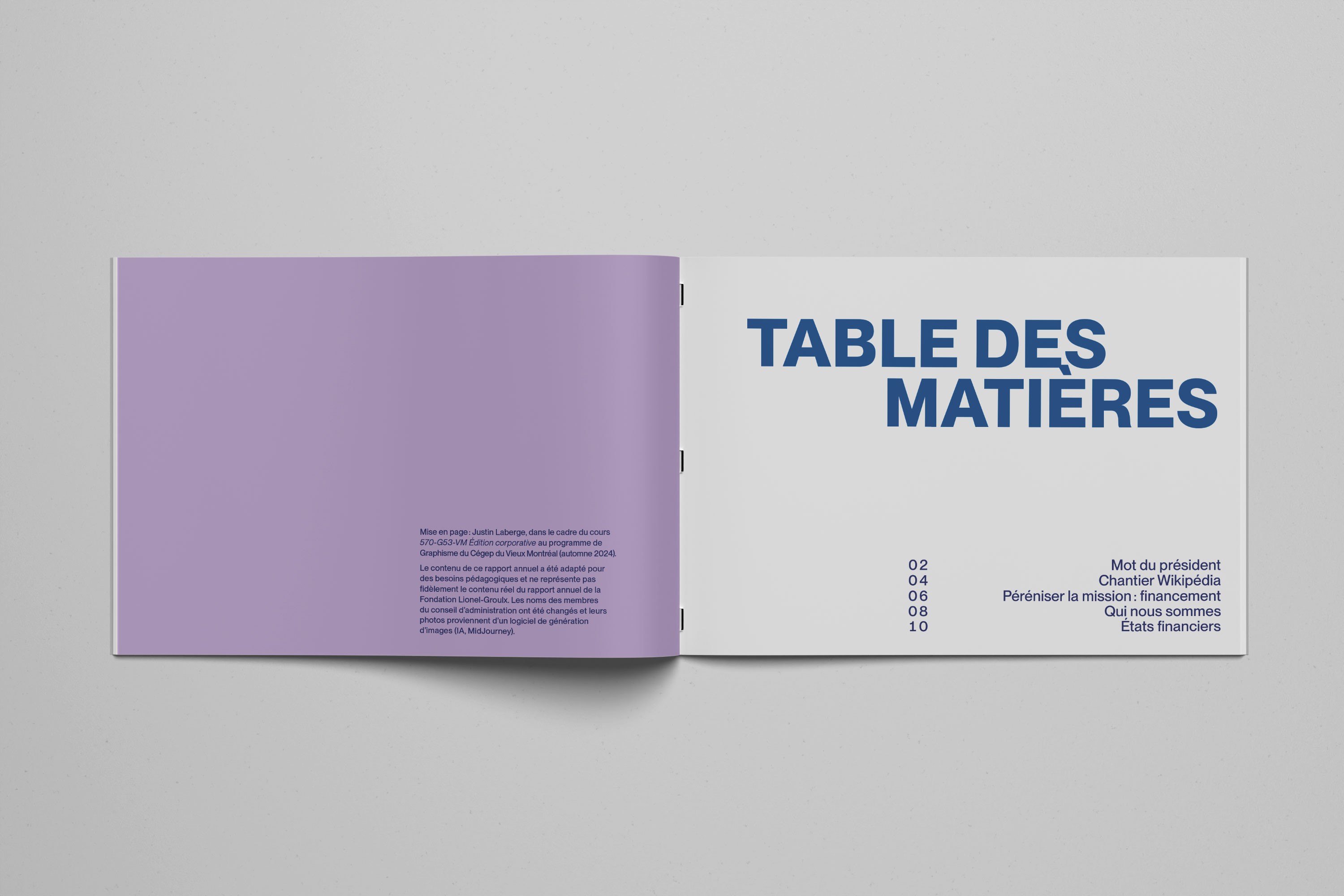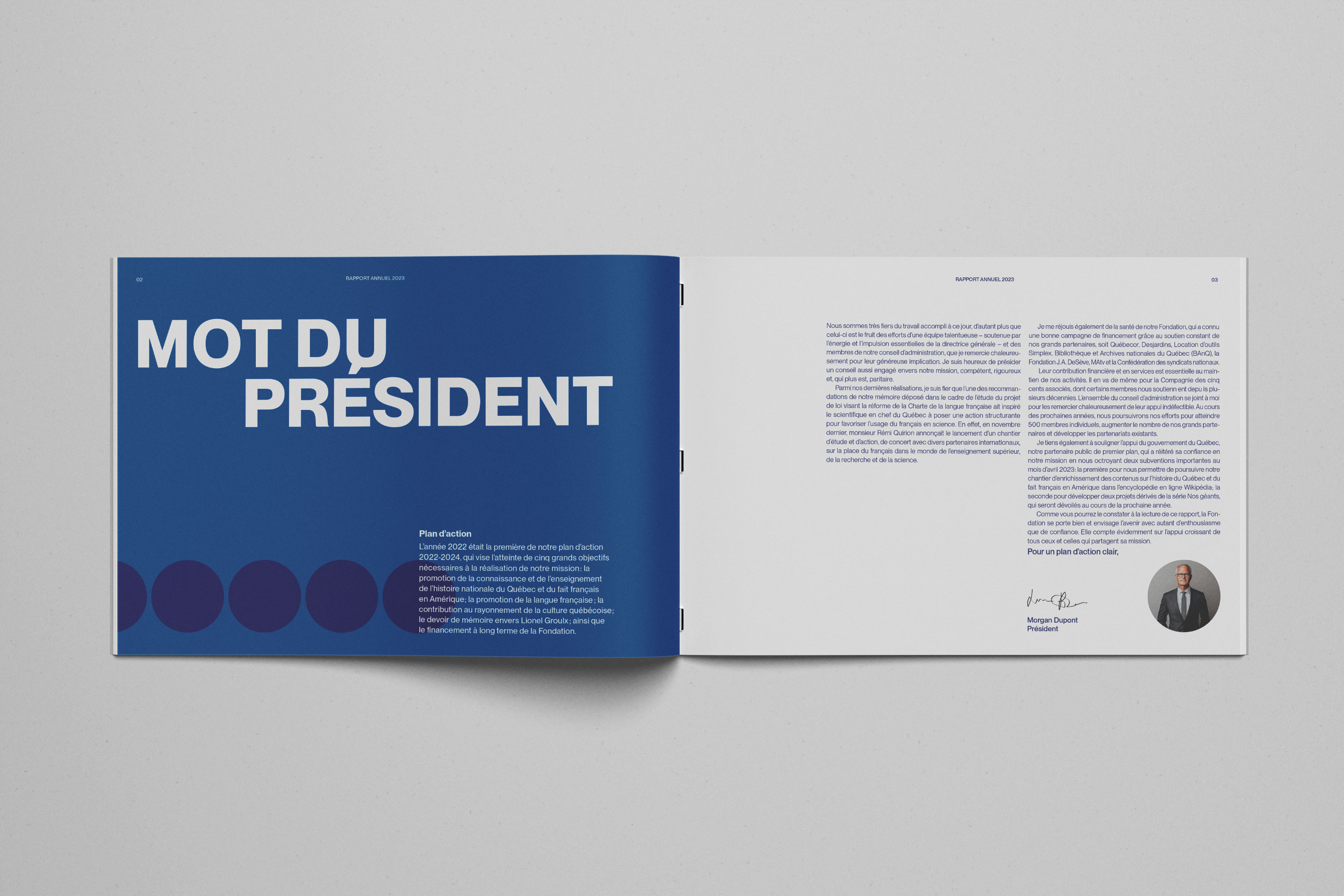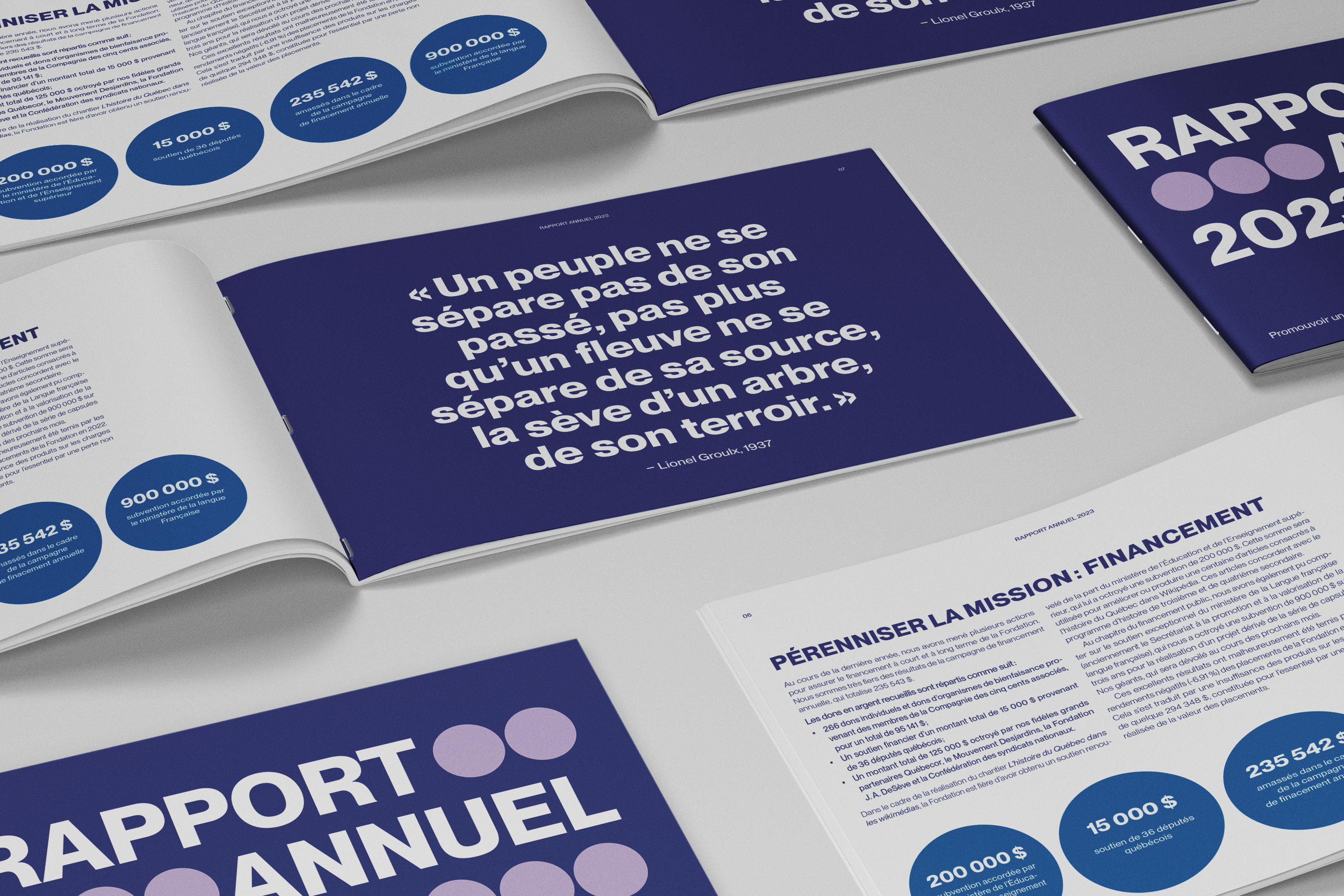 Mise en page d’un rapport annuel pour la Fondation Lionel-Groulx, dont la mission est de préserver la langue française et la culture québécoise. Développement et présentation de deux concepts de mise en page basés sur le guide de norme de la compagnie. Le concept retenu est poussé, peaufiné et imprimé.