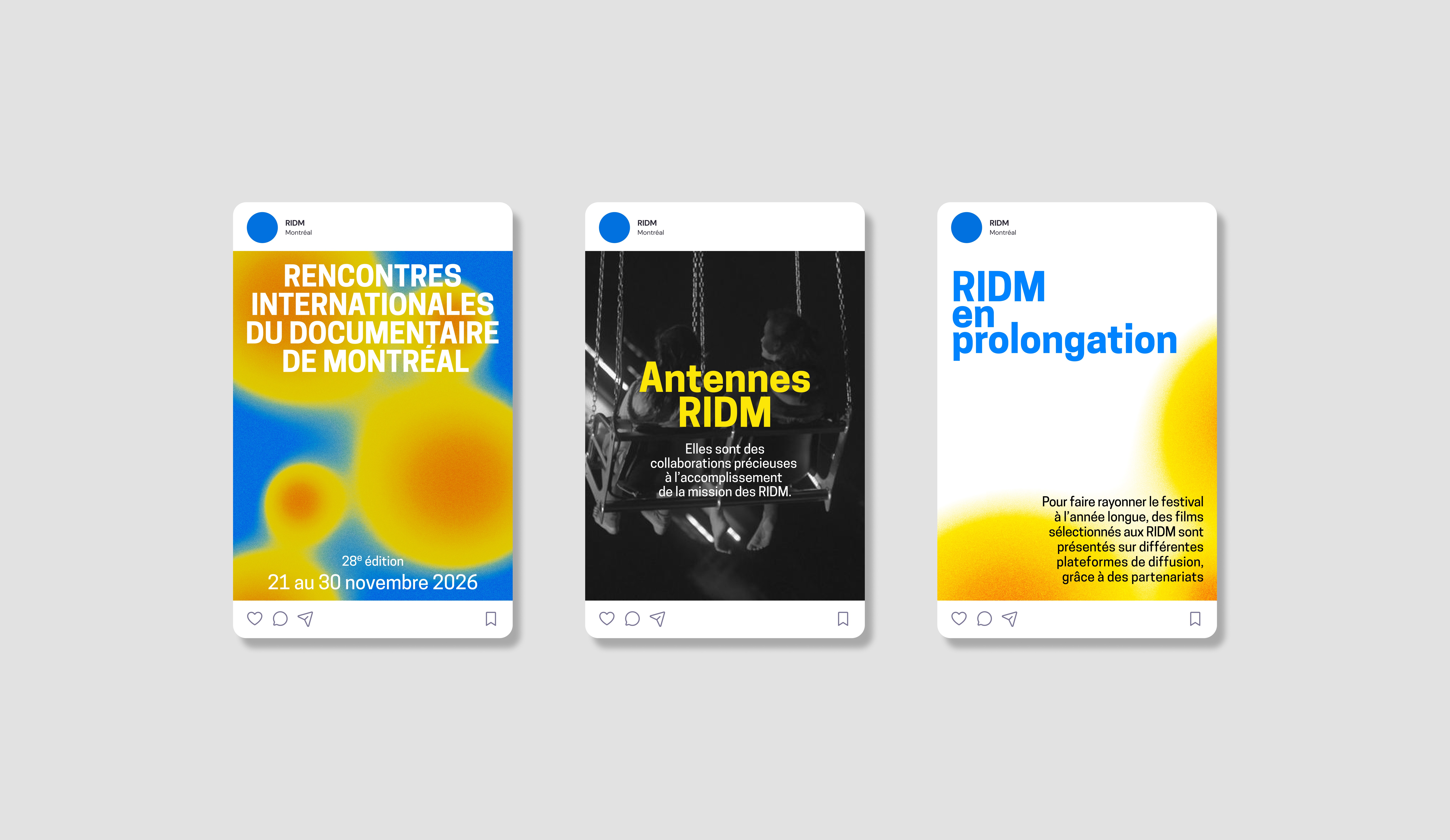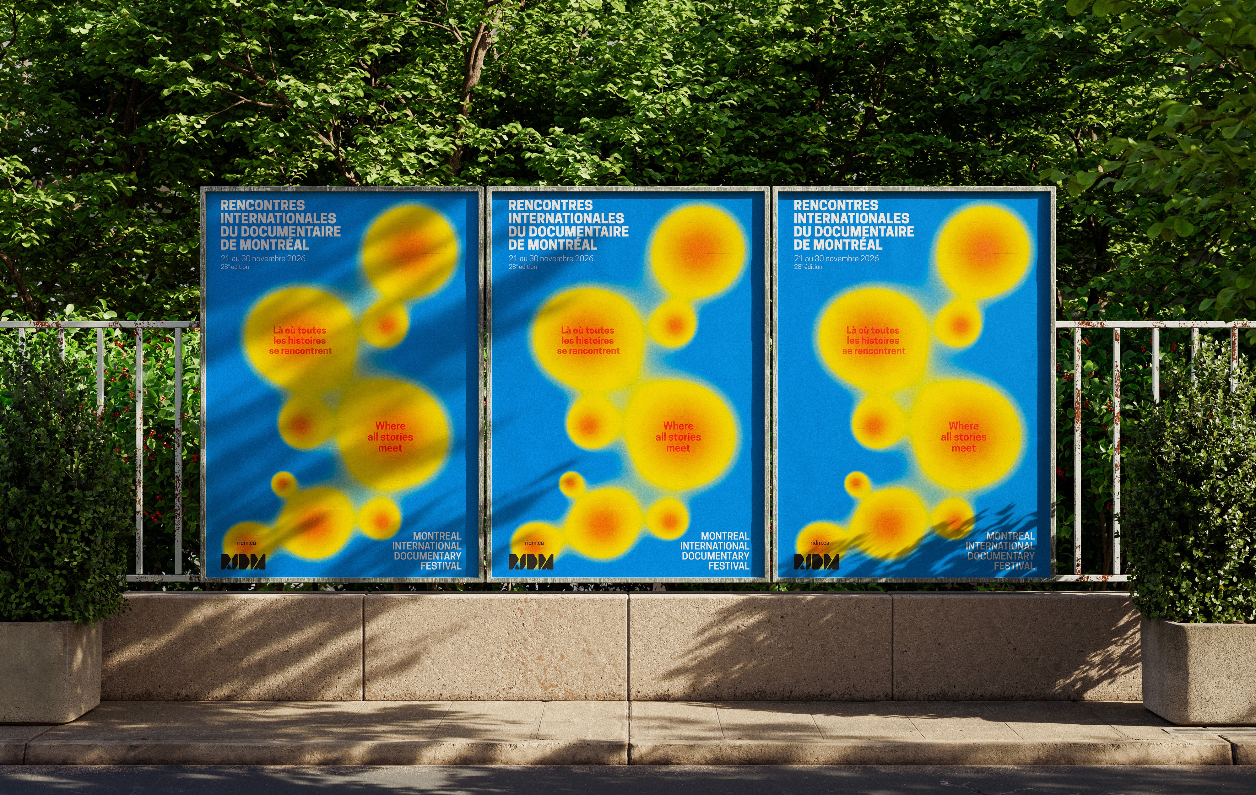 Création d’une affiche pour le RIDM, un festival de documentaire Montréalais. Ce festival mise sur le rencontre et l’humain. Il souhaite aussi décadrer le documentaire et le rendre accessible pour tous. Recherche, développement de 3 concepts et présentation au client. Le concept retenu est peaufiné selon les commentaires du client. Il est ensuite imprimé. Cette affiche symbolise la rencontre et la discussion par ses formes fluides se combinant les unes aux autres. Les couleurs, qui représentent la vue d’une caméra thermique, font un lien avec la chaleur humaine ainsi que les sujets chauds qui sont abordés dans les documentaires. On y voit donc une foule de gens qui échangent leurs idées.